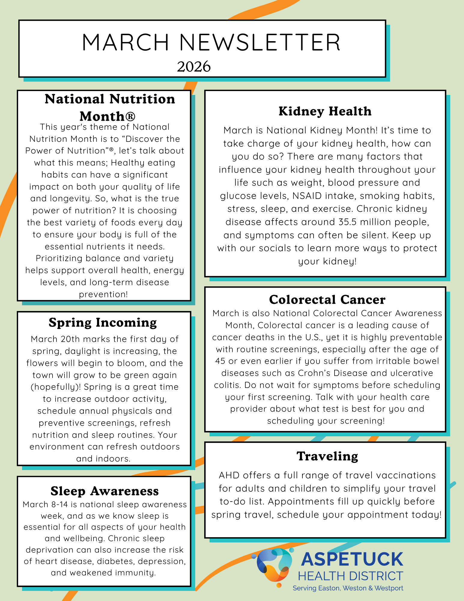 The Aspetuck Health District strives to promote health and well-being, prevent disease, and ensure a clean and safe environment for the towns of Easton, Weston, and Westport, Connecticut.